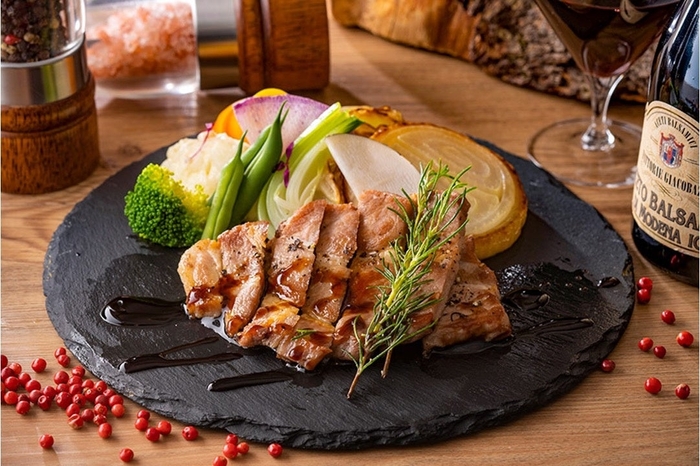 「香川県産豚肉の炙りステーキ」はライブキッチンから焼きたて熱々をご提供いたします。