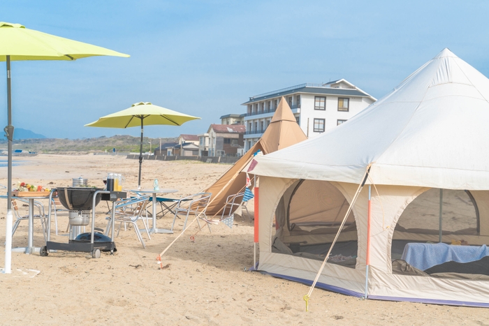 リョカンピングとは、日中はグランピングテントを基地に海遊びやアクティビティ、豪華なバーベキューなどを楽しみ、夜は旅館でゆっくり過ごすなど、アウトドアを思いっきり楽しみながらも旅館で快適に過ごせる新しい宿泊スタイルです。