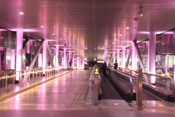 JR日立駅自由通路では、桜の花をイメージしたイルミネーションが装飾され、まるでさくらのトンネルに包まれているかのようなロマンチックな光の世界が表現されています。ライトアップもさくら色から暖かい陽射しの色に変化していく様子が見られ、いつもと違った駅の表情を見ることが出来ます。