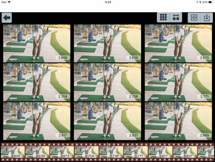 一時停止することで、そこまでの時間(最初に設定した遅延時間分)の映像を静止画でコマ送り・コマ戻しできます。さらには、その静止画を画面を分割して、画面に複数同時に表示できます。素早い動きもこれで簡単に確認できます。例えば、ゴルフのスイングを振り始めから振り終わりまで16分割した画面で表示することで、スイングのどこが悪かったかを確認するなどが簡単にできます。