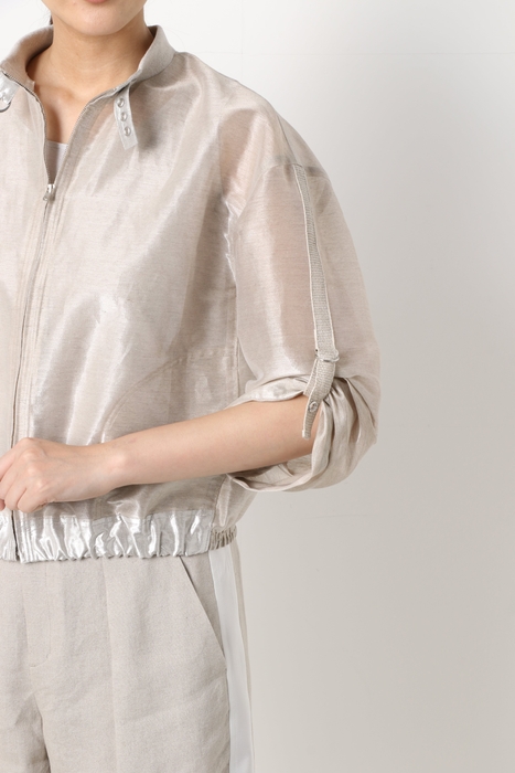 ・光沢と透け感を楽しめるオーバーサイズのブルゾンとロングシャツです。