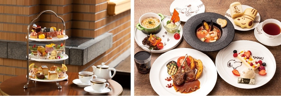 左:「PEANUTS」のキャラクターやストーリーをちりばめた「PEANUTS Friends' Afternoon Tea」 右:シュルツ氏へのオマージュを込めた「料理長スヌーピーのレストランプラン 10th story」