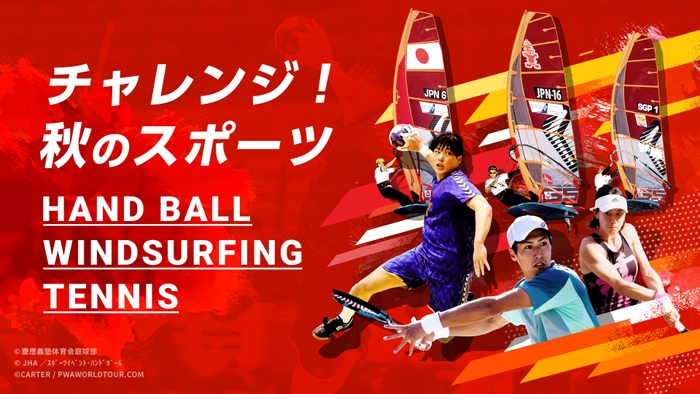 このたび、「チャレンジ!秋のスポーツ」と題し、「ハンドボール」「ウィンドサーフィン」「テニス」それぞれの大会の生中継を決定いたしました。放送を通じて、グローバルな未来に羽ばたいていく選手の勇姿をたっぷりとお届けします。