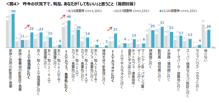 「1人で居酒屋」「1人でカフェ、食事処に行く」「1人でカラオケに行く」が10月末調査と比べて、10ポイント前後増加している。<図4>
