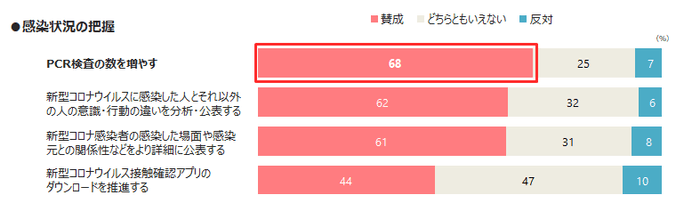 感染状況の把握としては、「PCR検査を増やす」に賛成が68%と最も多い。<図3>