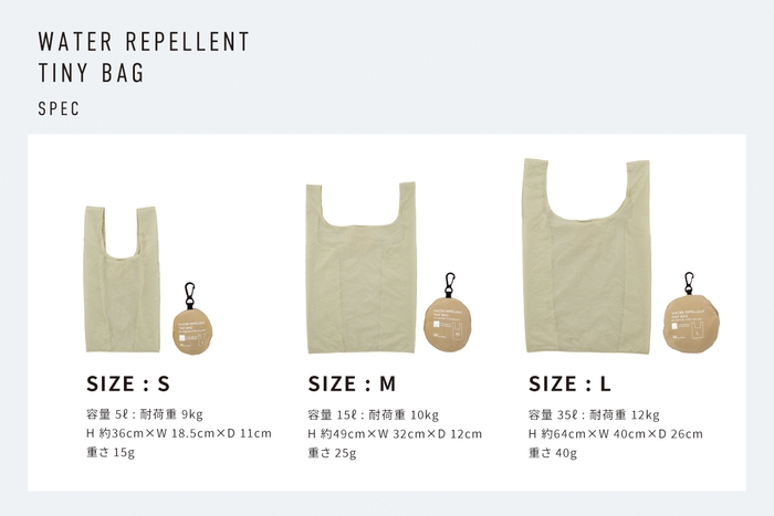 スマートフォンよりコンパクトな手のひらサイズで、カラビナも付いているので持ち運びに便利。エコバッグは畳むのが面倒・・・という方も多いですが、タイニーバッグに付いている収納袋は伸縮性のある生地を使用しているので畳まなくてもクシャッと押し込むだけでOK。収納袋はタイニーバッグ本体と一体化しているのでなくす心配もなし。もちろん生地に防水・撥水加工も施されています。