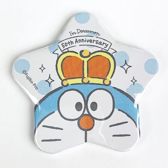 まずは星形のツヤっとした缶バッチ!入りきらないドラえもんの顔が可愛すぎる!王冠の赤が目を引いてワンポイントにバッチリ☆