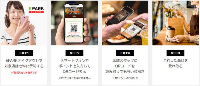 付与されたポイントは、EPARK・EPARKグルメでの予約を経て店内飲食する場合だけでなく、EPARKテイクアウトのGo To Eat対象店舗で注文商品を受け取る際の店頭決済時にも1ポイント=1円としてお支払いに充当いただけます。