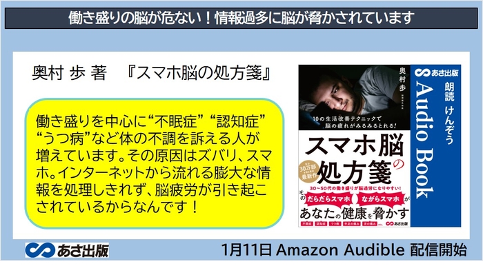株式会社あさ出版(代表取締役:田賀井弘毅、所在地:東京都豊島区)は、世界最大級のオーディオブック及び音声コンテンツ制作・配信サービスであるAmazon Audibleにて、奥村 歩著『スマホ脳の処方箋』( https://amzn.to/3iyzgc6 )の配信を2023年1月11日に開始いたします。