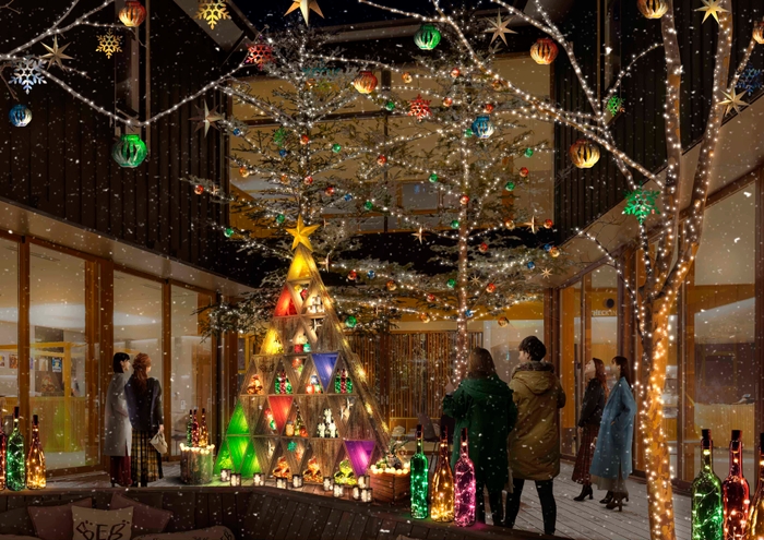 「居酒屋以上 旅未満」の体験を提供する「星野リゾート BEB5(ベブファイブ)軽井沢」は、2022年12月1日から25日まで、さまざまな資源の再利用を体感できるイベント「BEB サスティナブルクリスマス」を開催します。クリスマスといえば、華やかなイルミネーションや可愛くキラキラしたオーナメントが飾られたツリーが定番。BEB5軽井沢では、台風や強風、積雪などによって倒木の恐れがあるために伐採された間伐材を利用し、ホテル運営で生じた瓶などと融合して作ったクリスマスツリーが登場します。さまざまな資源を再利用して館内をエコロジカルに彩るクリスマスイベントです。