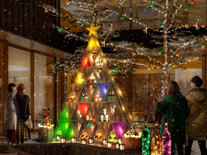 定期的に手入れとして伐採されている間伐材を土台とした、アップサイクル(*)クリスマスツリーがTAMARIBAの中庭に登場します。装飾にはホテル運営で生じた瓶や、缶などを使い、色鮮やかに素敵にクリスマスツリーを彩ります。