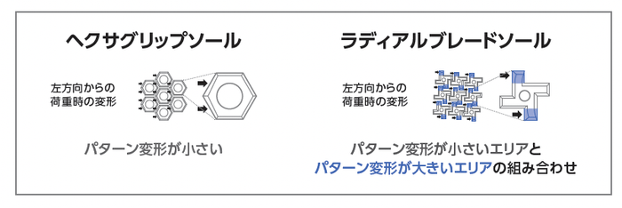 パターンの変形を促した新形状ソールを採用。変形の大きいエリアと小さいエリアを組み合わせることで、縦・横・斜め方向へのグリップ性がさらに向上しました。