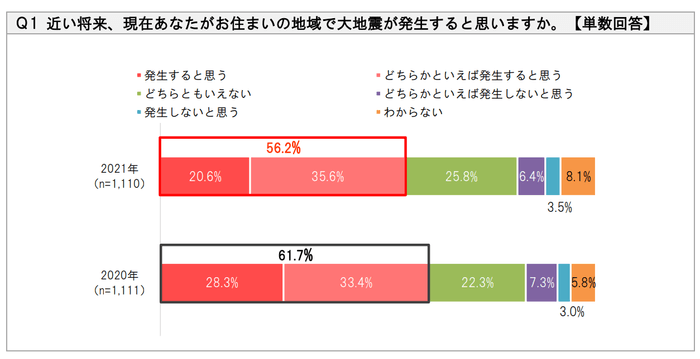 お住まいの地域における将来の大地震発生の可能性について聞いたところ、「発生すると思う(どちらかといえばを含む)(56.2%)」が過半数を超えたものの、昨年(61.7%)より減少する結果となりました。このほか、大地震で不安に感じること、家庭で行っている地震対策などの質問においても、全体の回答比率が昨年と比べて減少傾向となりました。