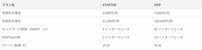 最大の強みは、ネットワーク監視だけでなく、ネットワーク上のサーバー監視、また、サーバー上のアプリケーションパフォーマンス監視(APM)、ユーザー視点のWebサイト監視までサポートする豊富な監視機能です。必要な監視機能を必要な分だけ使うことができ、低価格でスモールスタートできるので失敗することがありません。