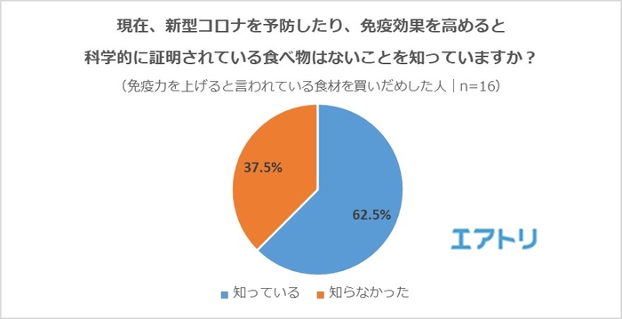 こちらは「知らなかった」と答えた人が37.5%いました。トイレットペーパー・ティッシュとは異なり、免疫力を上げると言われている食材については情報に踊らされて真実を知らないまま買いだめに走った人も一定数いるようです。