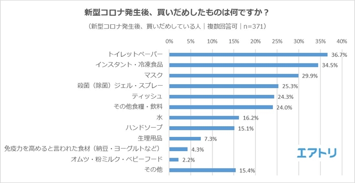 ―「トイレットペーパー」が36.7%で1位になった他、「免疫力を高めると言われた食材」を買いだめした人も4.3%いました。