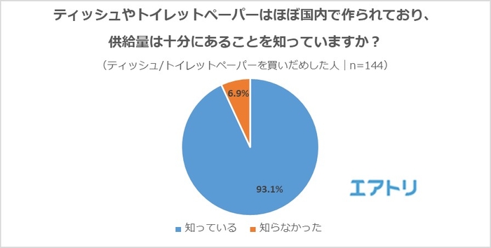 ティッシュ・トイレットペーパーを買いだめした人のうち、93.1%もの人が供給量は十分にあることを「知っている」と回答しました。多くの人が真実を知りながらも、実際に棚に在庫がない状況を目の当たりにし、不安から買いだめに入ってしまったようです。