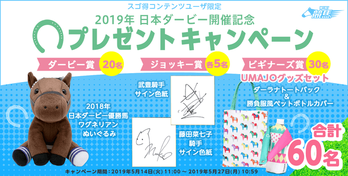 スマートフォンコンテンツ提供サービスを運営する株式会社デジマース(本社:東京都品川区、代表取締役社長:石川 達絵)は、2019年5月14日(火)11時より、株式会社NTTドコモ「スゴ得コンテンツ(R)」内で提供中の「WIN!競馬 forスゴ得」利用者を対象に、「2019年 日本ダービー開催記念プレゼントキャンペーン」を実施いたします。
