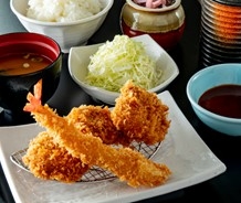 海老フライとヒレかつを一度に贅沢に楽しめる定食です。大きめの海老はプリッと歯ごたえよく、ヒレかつはしっとりやわらかに仕上げました。