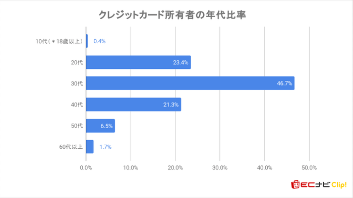 もっともクレジットカードを所有する年代は「30代」で、全体の46.7%の回答がありました。2位は「20代」で、23.4%の割合を占める結果に。また男女比率は、「男性:41.9%」「女性:57.0%」となりました。