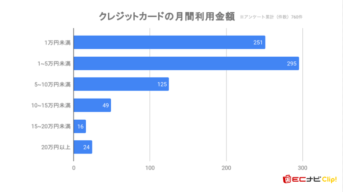 クレジットカードの所有枚数については、32.5%のユーザーが「3枚」と回答したことから、ポイントを意識した買い物をはじめ、あらゆるシーンでクレジットカードを使い分けていることが伺えます。また、もっとも多い月間利用金額は「1~5万円未満」が全体の38.8%を占める割合となり、続いて「1万円未満:33.0%」、「5~10万円未満:16.4%」という結果になりました。
