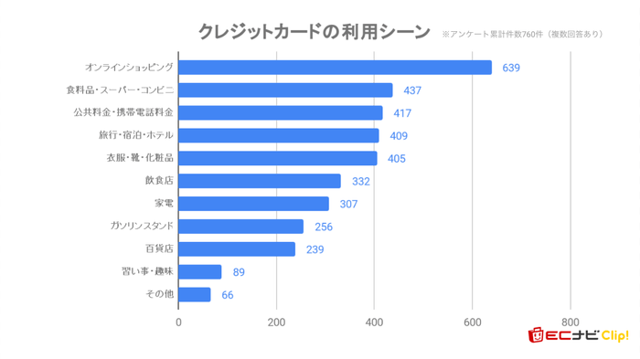 クレジットカードの利用シーンについて、760件(複数回答可)のアンケート調査を実施。そこでわかった上位3つの利用シーンは、「オンラインショッピング:639回」「食料品・スーパー・コンビニ:437回」「公共料金・携帯電話料金:417回」であることが判明しました。最近では、高還元率なクレジットカードの種類が増えたことから、料金支払い時のポイ活(ポイントを貯めて使う活動のこと)への関心の高まりが期待されます。