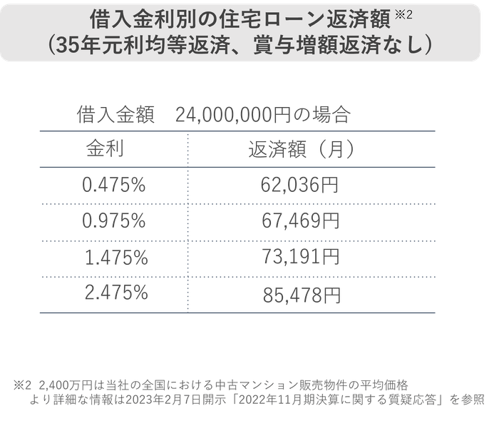 さらに右の表は、将来の金利上昇リスクを示したものですが、仮に金利が2.475%まで上昇しても返済額は約8.5万円です。依然として平均家賃を下回っており、持ち家の支払い優位性が続くことが見て取れます。