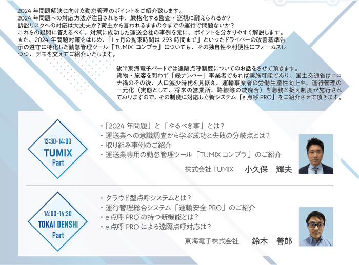 ■詳細はこちらから:【TUMIX×東海電子合同ウェビナー】中小運送会社の取組実例から学ぶ2024年問題対策&遠隔点呼セミナー