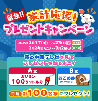 緊急!!家計応援!プレゼントキャンペーン 2月17日~3月2日に実施 夜の中京テレビを見て応募しよう!