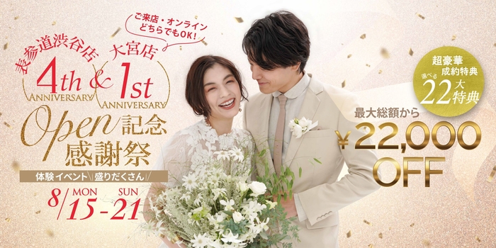 この度、株式会社デコルテ(兵庫県芦屋市)が運営するウェディングフォトスタジオ「スタジオAQUA表参道渋谷店/大宮店」では、表参道渋谷店の4周年・大宮店の1周年を記念して、2022年8月15日(月)~8月21日(日)の7日間限定で『オープン4周年&1周年記念感謝祭』を実施することとなりました。皆様への感謝の気持ちを込めまして、豪華特典をご用意してお待ちしております。