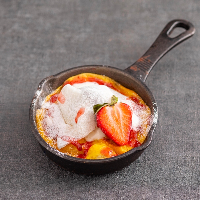 店内の石窯オーブンで焼き上げたフレンチトースト。いちごとあずきを求肥で包んだいちご大福仕立て。