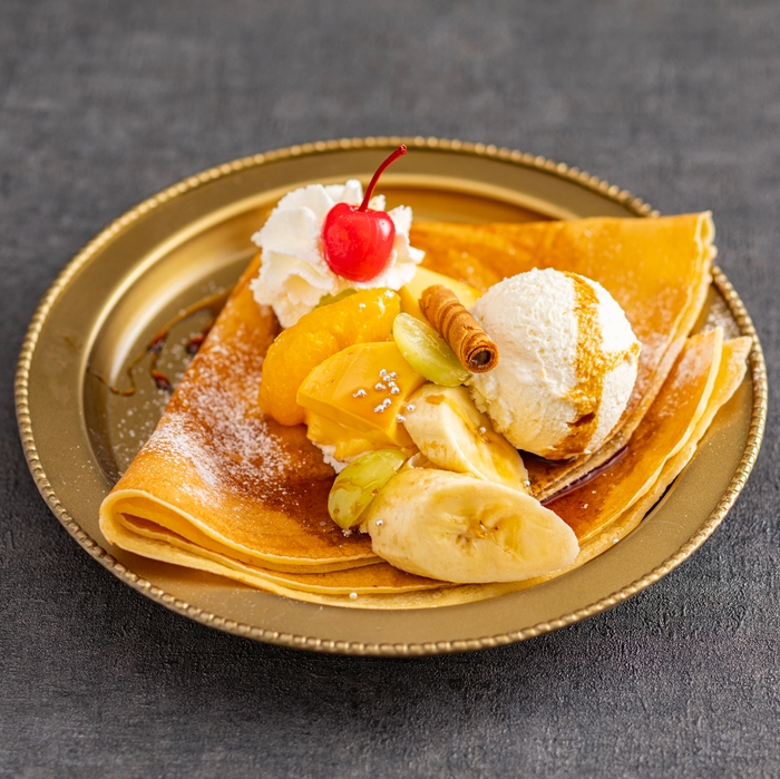 目の前で焼き上げる、出来立てクレープにカスタードプリン、バナナ、オレンジ、ぶどう、さくらんぼを飾り、プリンアラモードをイメージしました。