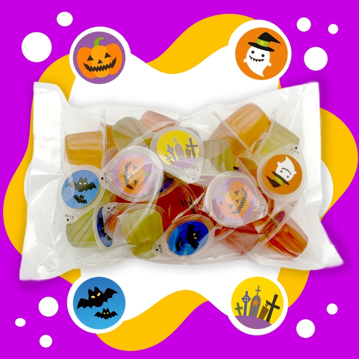 新商品「ハロウィンカラフルゼリー」は、ハロウィンのイラストがデザインされたひとくちサイズのミニカップゼリーです。ストロベリー、青りんご、オレンジの3種類の味がランダムに入っており、ハロウィンパーティーやイベントでのお配りに最適です。