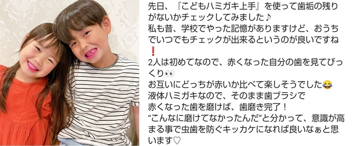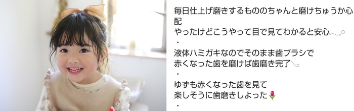 3名のママが、歯垢が赤く染まる液体ハミガキ『こどもハミガキ上手』をお試し!「こんなの探してたの!」「ゲーム感覚で楽しんでた」といった、ポジティブなコメントが寄せられました。以下に、ママたちの投稿の一部を引用し、ご紹介していきます!