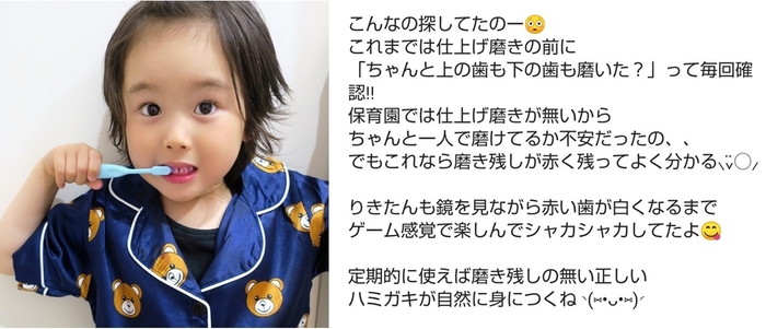 『こどもハミガキ上手』は、子どもたちが楽しみながら、正しい歯磨きのトレーニングをできるアイテム。3名のママのコメントからも、子どもたちが楽しく、自ら歯磨きをしていた様子がうかがえます。子どもたちの自主性をはぐくむことができるので、なんでも自分でやりたがる年頃の子どもたちに特におすすめです!