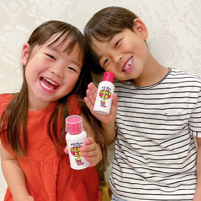 歯垢を赤く染め、磨き残しのチェックをしながら同時に歯磨きをすることができる液体ハミガキです。子どもが楽しみながら、正しい歯磨きのトレーニングをできるアイテムです。