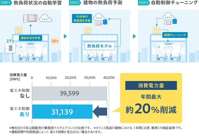 本サービスは、空調機を遠隔から自動制御することで消費電力量の削減と快適性の両立を実現するサービスです。空調機の運転データとクラウドから得られる天気や日射などの外部情報からAIが部屋ごとの熱負荷を予測し、冷やしすぎや暖めすぎなどのムダな運転を防ぎ、省エネ性と快適性を維持します。国内外の30件の検証物件において、快適性を低下させることなく、消費電力量を通年最大約20%※2削減しました。