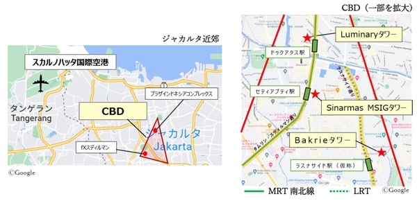 本施設は、東南アジア有数の世界都市ジャカルタ市内の中心地区CBD※1にあるメイン通りに面しており、地下鉄「ジャカルタ都市高速鉄道(MRT南北線)」やLRT※2等の駅から非常に近い所に位置しています。また、「Luminaryタワー」はP(プレミアム)グレード※3、「Sinarmas MSIGタワー」「Bakrieタワー」はAグレード※3と評価されているなど、高いスペックを有するハイグレードなオフィスビルです。
