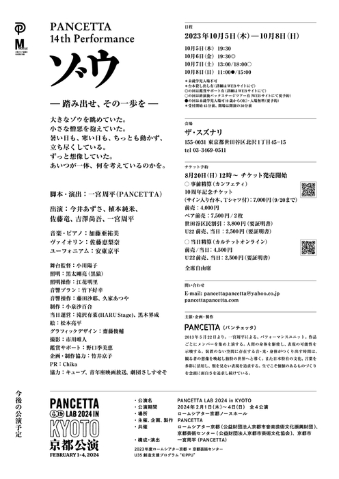 『PANCETTA 14th performance “ゾウ”』が2023年10月5日 (木) ~2023年10月8日 (日)に下北沢 ザ・スズナリ(東京都世田谷区北沢1-45-15 )にて上演されます。