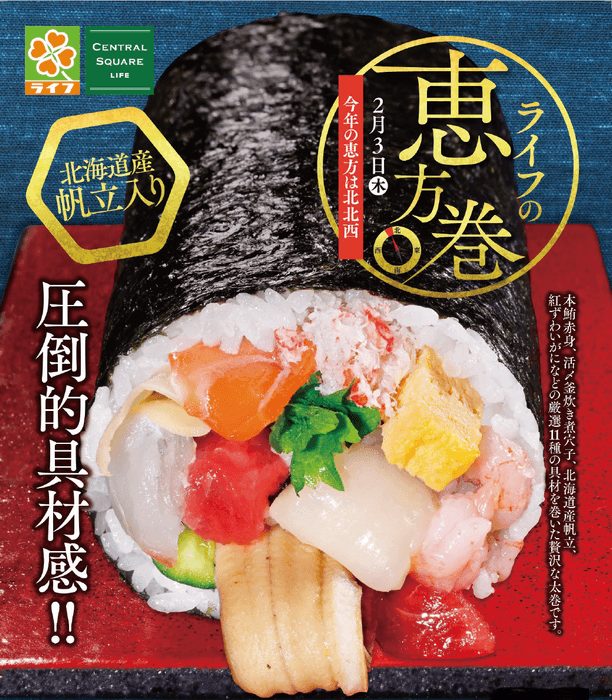 “おいしい” “ワクワク” “ハッピー” をお届けするライフコーポレーションは、来年2月3日(木)の節分に向けて、今年もライフオリジナル恵方巻の予約販売を開始いたしました。