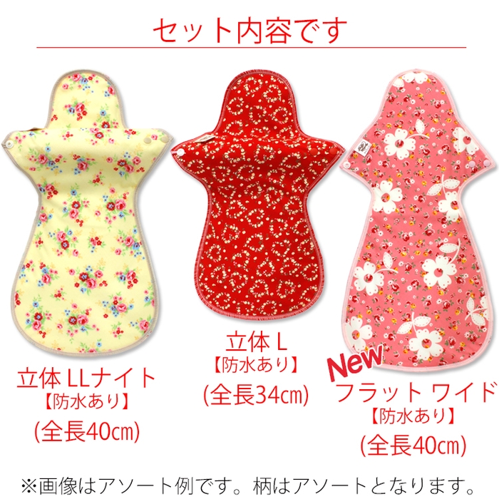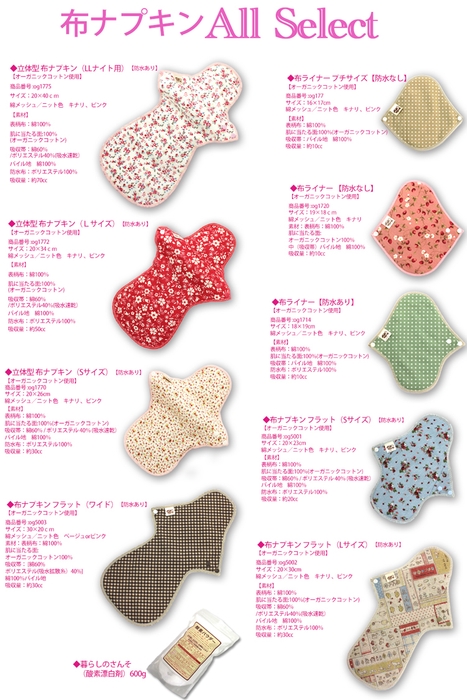 使い捨て布ナプキンから夜用の立体型布ナプキンまで、様々な用途の商品が入っています♪