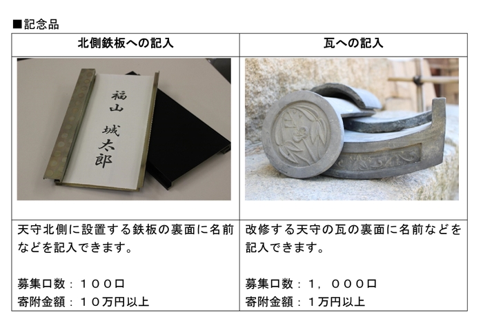 クラウドファンディングで募った寄附により,“全国唯一”といわれる福山城の天守北側鉄板張りなどの外観復元を行います。ご寄附いただいた方には,北側鉄板張や瓦の裏面に名前などを記入していただくイベントの開催を予定しています。