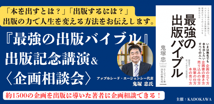 作家のエージェント会社、株式会社アップルシード・エージェンシー(所在地:東京都新宿区 代表取締役:鬼塚 忠)は、代表・鬼塚 忠の新刊『最強の出版バイブル』(KADOKAWA刊/2025年9月11日発売)の刊行を記念し、2025年9月18日(木)にKADOKAWA本社ビルにて、出版記念講演と<企画相談会>を開催します。