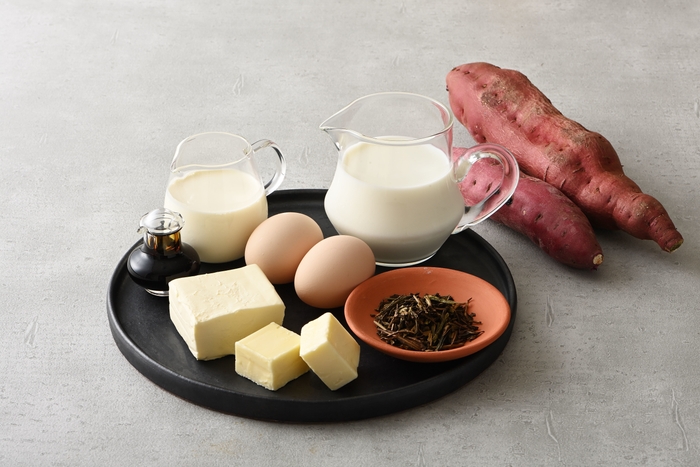 焼き芋ペーストを使用した濃厚な蜜芋の土台をベースに、味・見た目のアクセントとなる紫芋の層と、生クリームとクリームチーズをたっぷりと混ぜ込んだレアチーズケーキの層を重ねた、3層仕立てのお芋チーズテリーヌです。仕上げにチーズケーキの表面にたっぷりグラニュー糖を乗せ、パリッとブリュレすることで、香りと見た目を華やかに仕上げました。