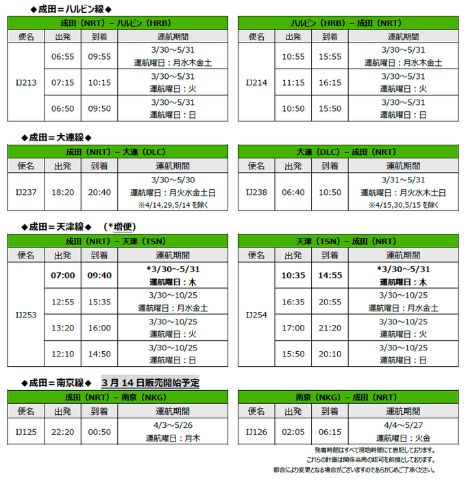 また、成田=南京線についても、3月14日に販売を予定しています。
