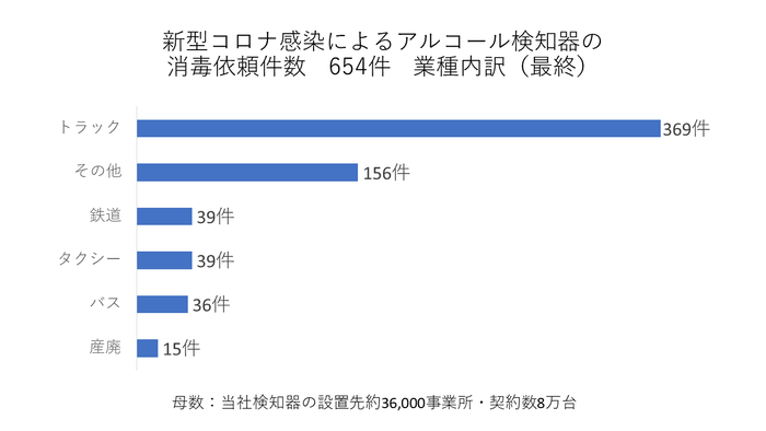 当社の検知器ユーザは、トラック業が最も多いことから、必然的にトラックが最も多いという結果となりました。そして、昨今の白ナンバー義務化・法制化動向により、運輸業以外の一般企業の事業所からの消毒依頼件数が一気に増え、2番目に多いという結果となりました。