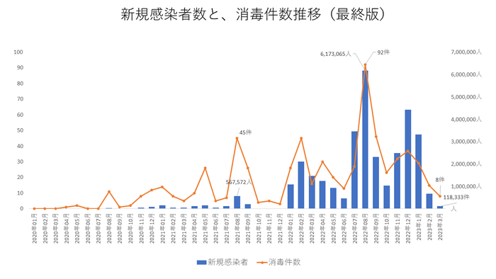アルコール検知器は本当に新型コロナウィルスを拡散する「危ない」機器だったのか?アルコール検知器の消毒受託件数と新型コロナウィルス感染者数の関係性、最後のレポート2023年3月版