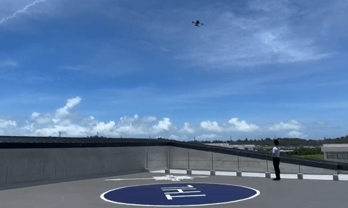 リアルグローブ、株式会社タップ主催「DX実証ホテル・タップホスピタリティラボ沖縄」オープニングセレモニーに、ドローンを使用したAED搬送の実証実験にイーシーセンターと共同参加