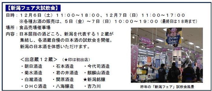 当フェアでは、日本一の蔵元数を誇る新潟を代表する12蔵が集結し、各酒蔵自慢の日本酒を取り揃えます。また12月6日(土)・7日(日)の2日間、各酒蔵が日本酒を紹介しながら販売する「新潟フェア大試飲会」を開催します。