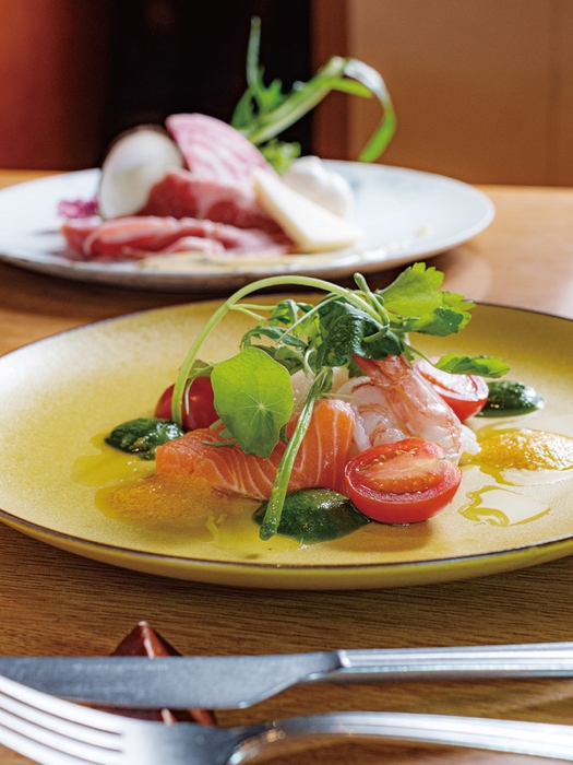 河豚焼霜造りと地場産香り野菜のサラダ仕立て~仙台せり ラディッシュ 自家製唐墨~